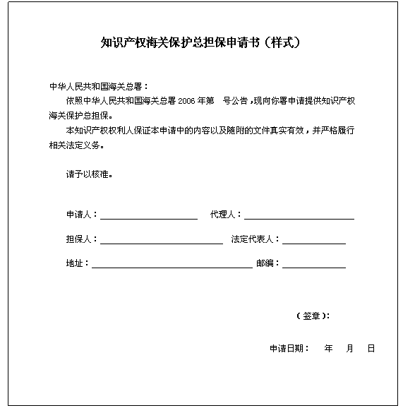 In light of the Announcement No.___2006 of the General Administration of Customs, an application is hereby submitted for a general bond for Customs IPR protection. This IPR holder guarantees that the contents of the application and the documents attached thereto are genuine and valid, and that it will strictly perform its statutory obligations.